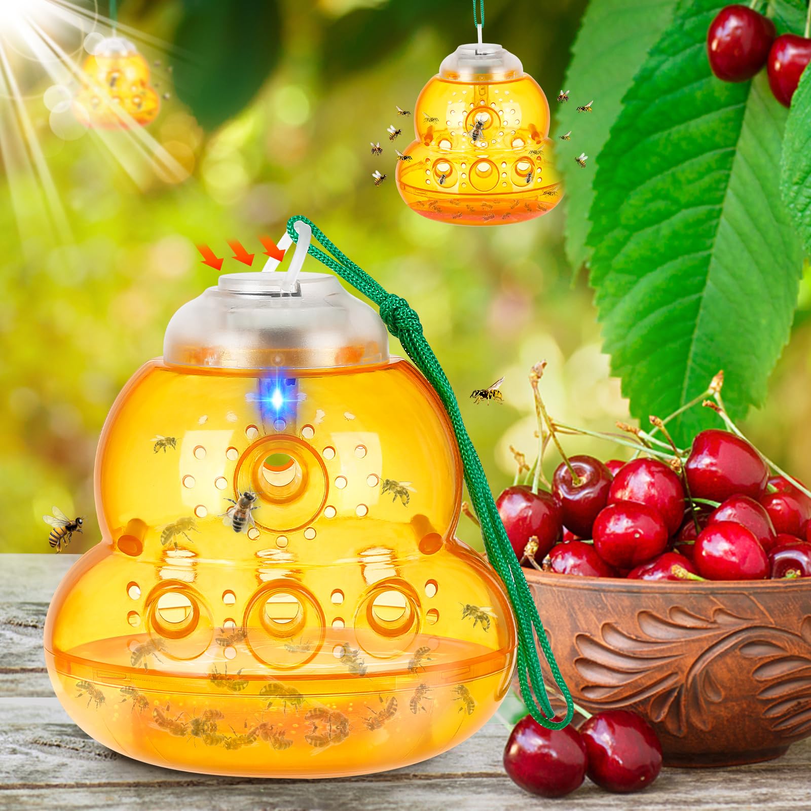 JNKNT Solar Wasp Trap, Outdoor Hanging LED Blue Light Bee Catcher, Non-Toxic Reusable Hornet & Yellow Jacket Trap, Solar Panel Wasp Insect Killer, 1 Pack – Orange