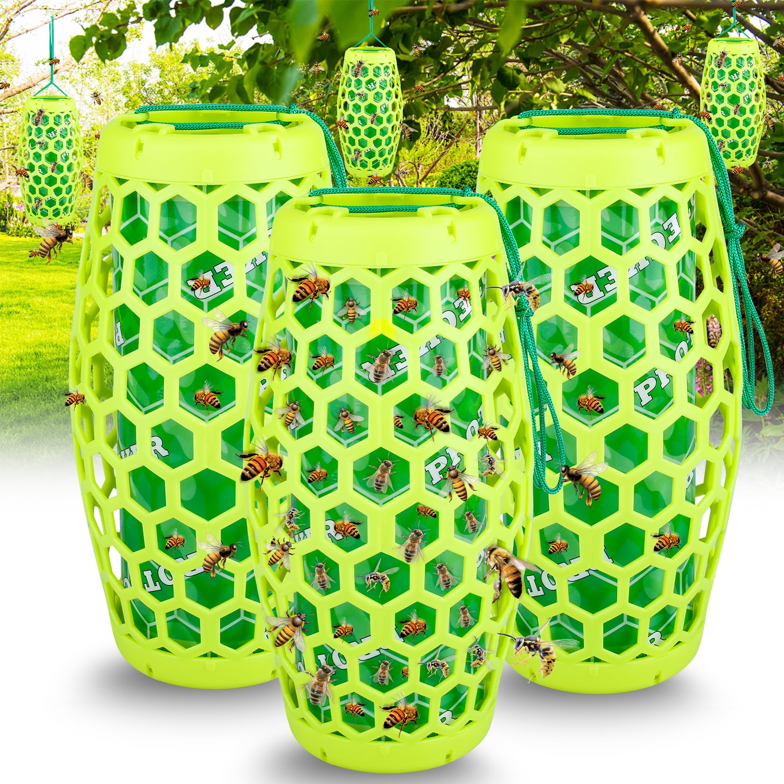 JNKNT Wasp Trap Bee Catcher – Outdoor Hanging Carpenter Bee Traps with 6 Sticky Boards, Non-Toxic Reusable Hornet & Yellow Jacket Trap, 3 Pack (Green)